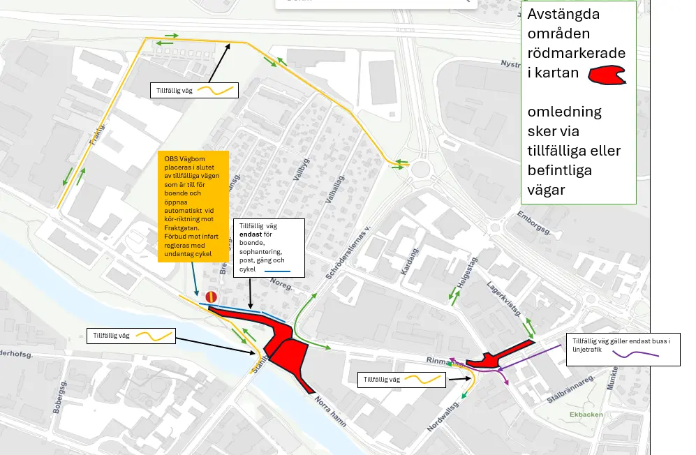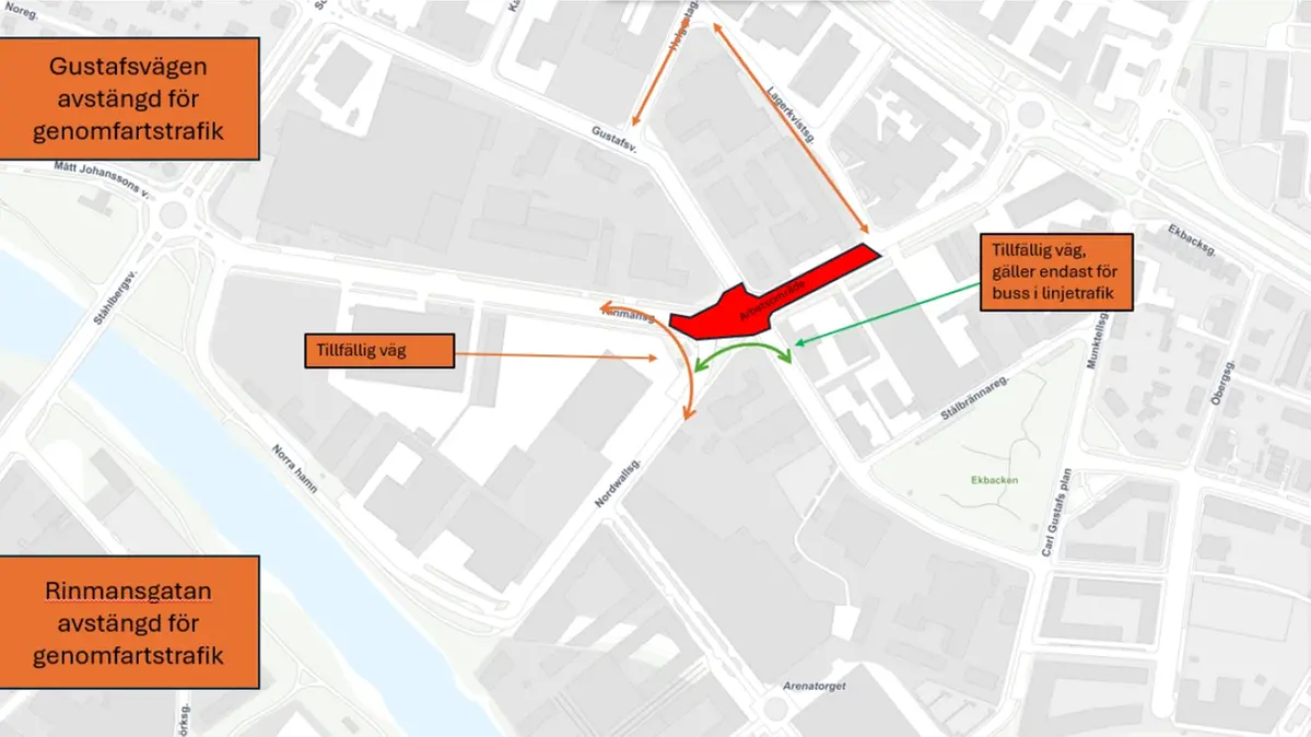 Pågående VA-arbete gör att Rinmansgatan, Gustafsvägen och Mått Johanssons väg är avstängda för genomfartstrafik. Omledning sker via nya tillfälliga vägar och vissa befintliga, se kartbilder.